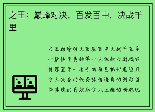 之王:巅峰对决,百发百中,决战千里